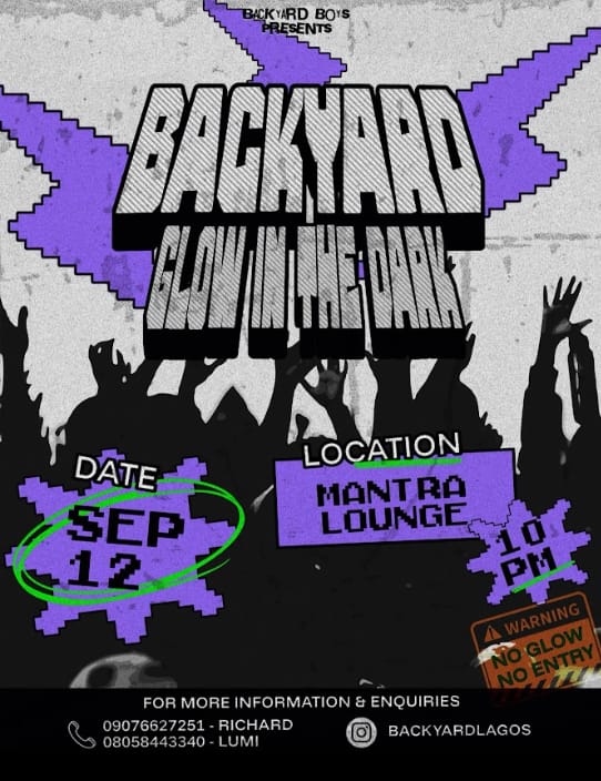![]() | 2. BACKYARD: GLOW IN THE DARK Mantra Lagos, VI | 10:00 PM | ₦8,200 Neon lights, dark corners, and music that keeps you moving till the glow sticks fade. This is not your regular Friday night. |