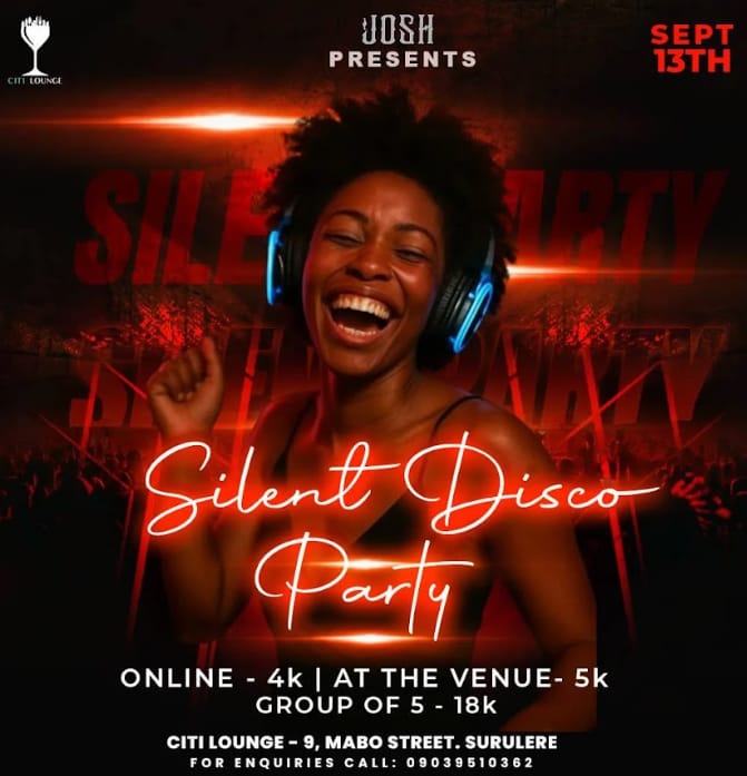 ![]() | 9. CITI LOUNGE – SILENT DISCO PARTY Citi Lounge, Surulere | 7:00 PM | ₦5,000 Three DJs. Three channels. One headset. Switch it up any time while the outside world hears… nothing. |