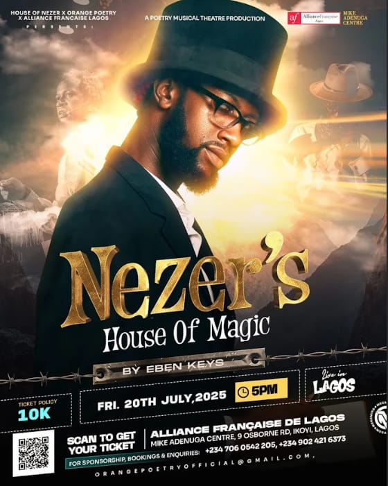 ![]() | 13. NEZER’S HOUSE OF MAGIC BY EBEN KEYS Alliance Française, Ikoyi | Sunday, July 20th, 5:00 PM | ₦10,000 Nezer’s House of Magic will serve magic with storytelling sauce through sleight-of-hand and deep narratives. Expect laughter, wonder, and a reminder that surprise still exists IRL. |
