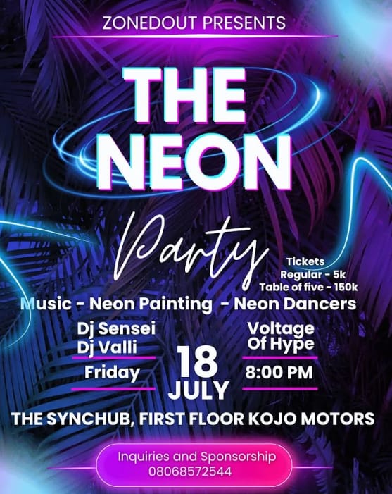 ![]() | 2. THE NEON PARTY Kojo Motors Mabushi (First Floor) | Friday, 8:00 PM | ₦5,000 Blacklight, neon vibes, dancing silhouettes. This party’s LED energy brings the antidote to the Abuja weekday fade. |
